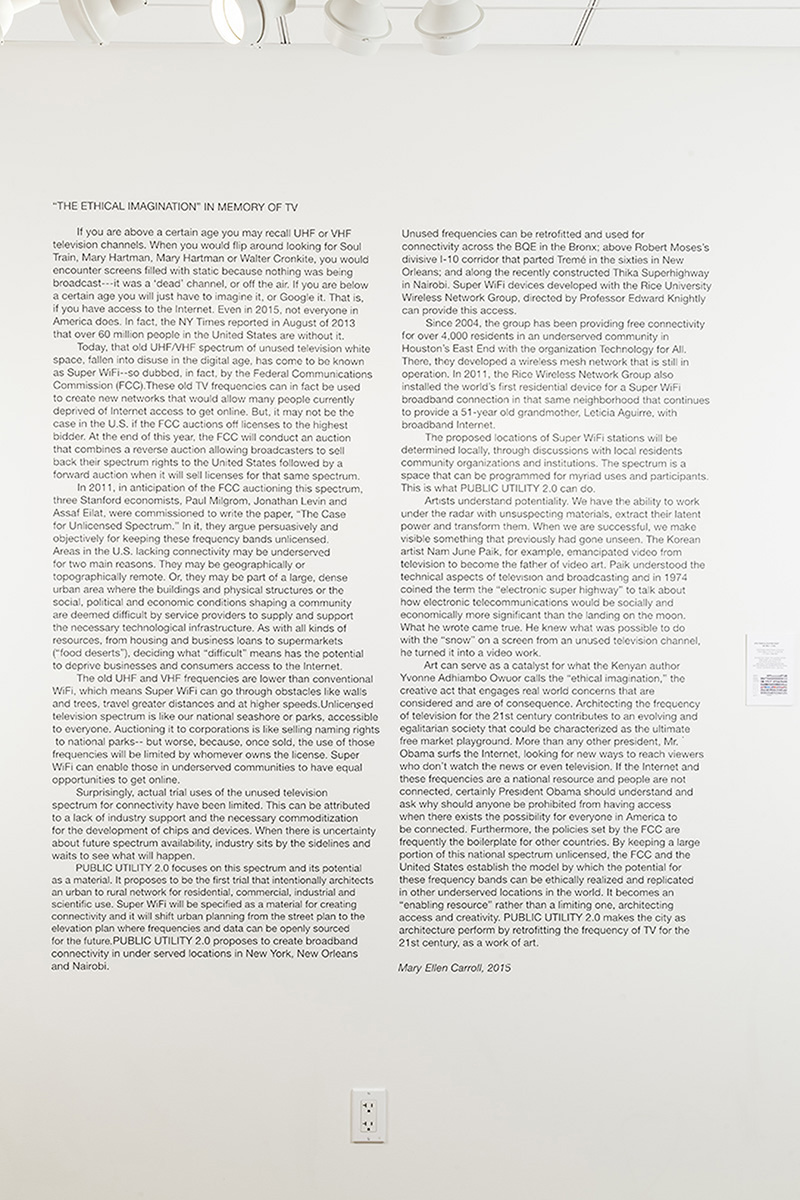 Art can serve as a catalyst for what the Kenyan author Yvonne Adhiambo Owuor calls the “ethical imagination,” the creative act that engages real world concerns that are considered and are of consequence. Architecting the frequency of television for the 21st century contributes to an evolving and egalitarian society that could be characterized as the ultimate free market playground. More than any other president, Mr. Obama surfs the Internet, looking for new ways to reach viewers who don’t watch the news or even television. If the Internet and these frequencies are a national resource and people are not connected, certainly President Obama should understand and ask why should anyone be prohibited from having access when there exists the possibility for everyone in America to be connected. Furthermore, the policies set by the FCC are frequently the boilerplate for other countries. By keeping a largeportion of this national spectrum unlicensed, the FCC and the United States establish the model by which the potential for these frequency bands can be ethically realized and replicated in other underserved locations in the world. It becomes an “enabling resource” rather than a limiting one, architecting access and creativity. PUBLIC UTILITY 2.0 makes the city as architecture perform by retrofitting the frequency of TV for the 21st century, as a work of art.